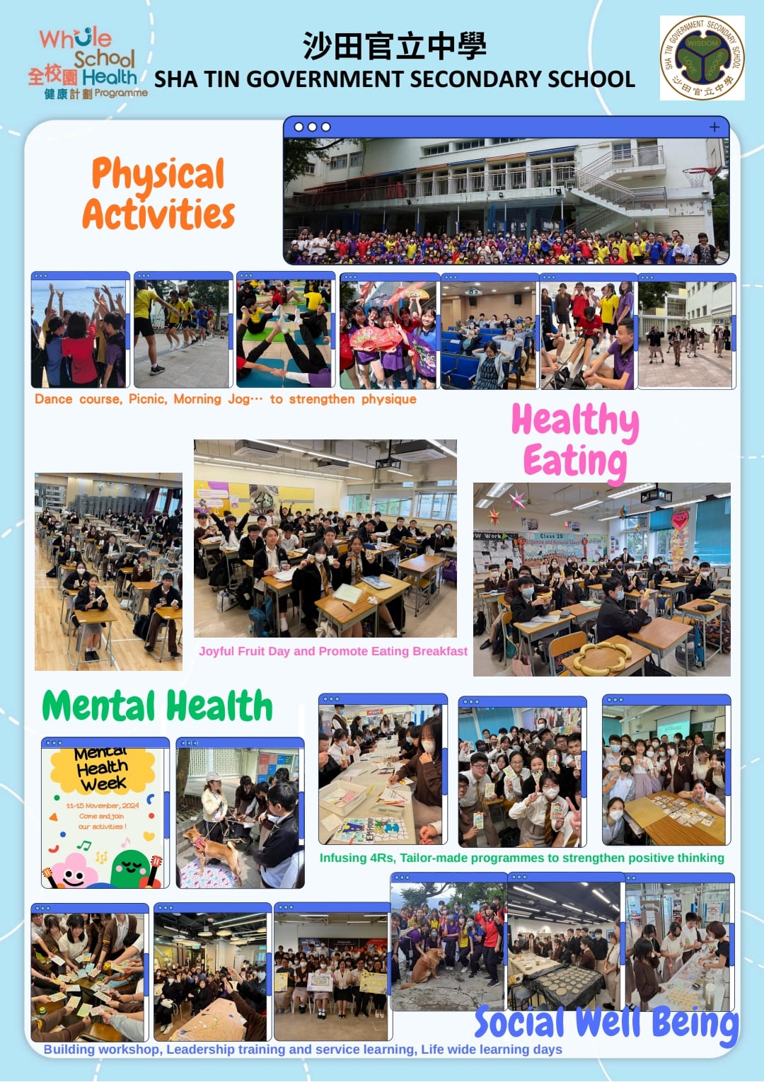 Our school is awarded as an Advanced School in 2024-2025 in the Whole School Health Programme. Health Promoting School framework was implemented in a whole school approach and comprehensive development in various areas is demonstrated in our school.